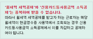 연말정산을 하다 보면 월세 세액공제와 신용카드 소득공제를 중복으로 받을 수 없다는 안내문이 있습니다. 이 안내문을 본 사람들은 월세 세액공제를 받으면 신용카드 소득공제를 못 받는 건가 오해하시는 분들이 있습니다.