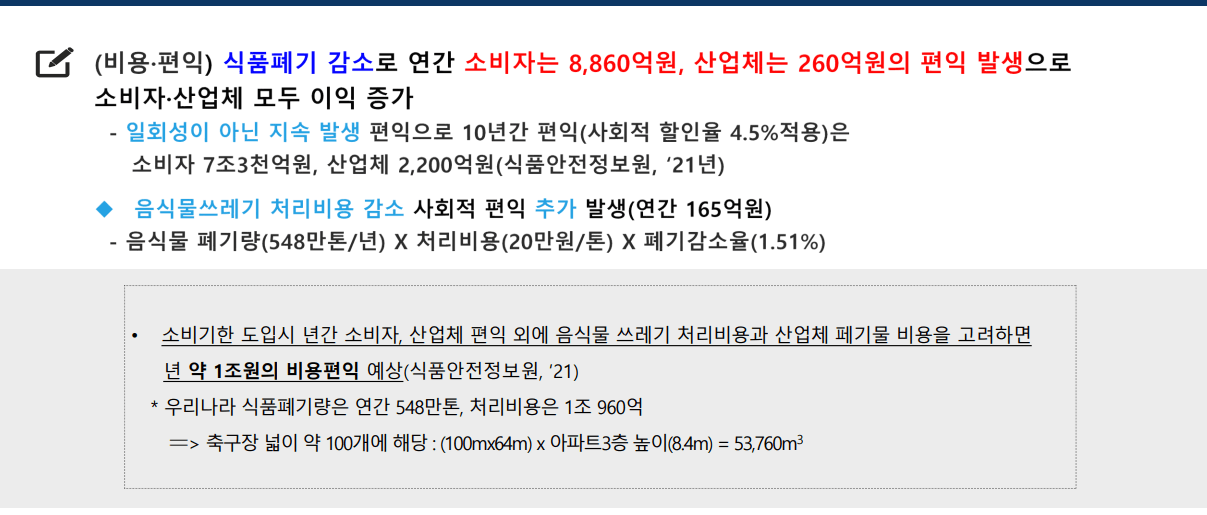 소비기한 표시제가 본격적으로 시행되면 폐기량이 줄어들며 연간 1조원정도 폐기물 처리비용을 절약할 수 있을 것으로 기대하고 있습니다. 또한 식품 폐기물 감소로 환경에도 많은 도움이 될 것으로 기대하고 있습니다.